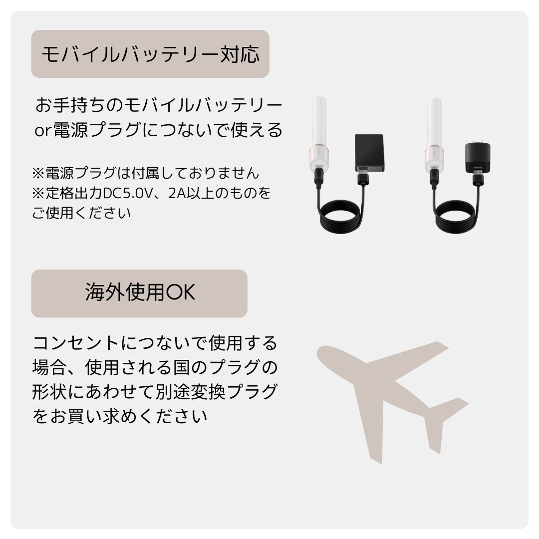USB給電式だから旅先や外出先、コ ンセントがない場所でもモバイルバ ッテリーにつなげばすぐに使えます。