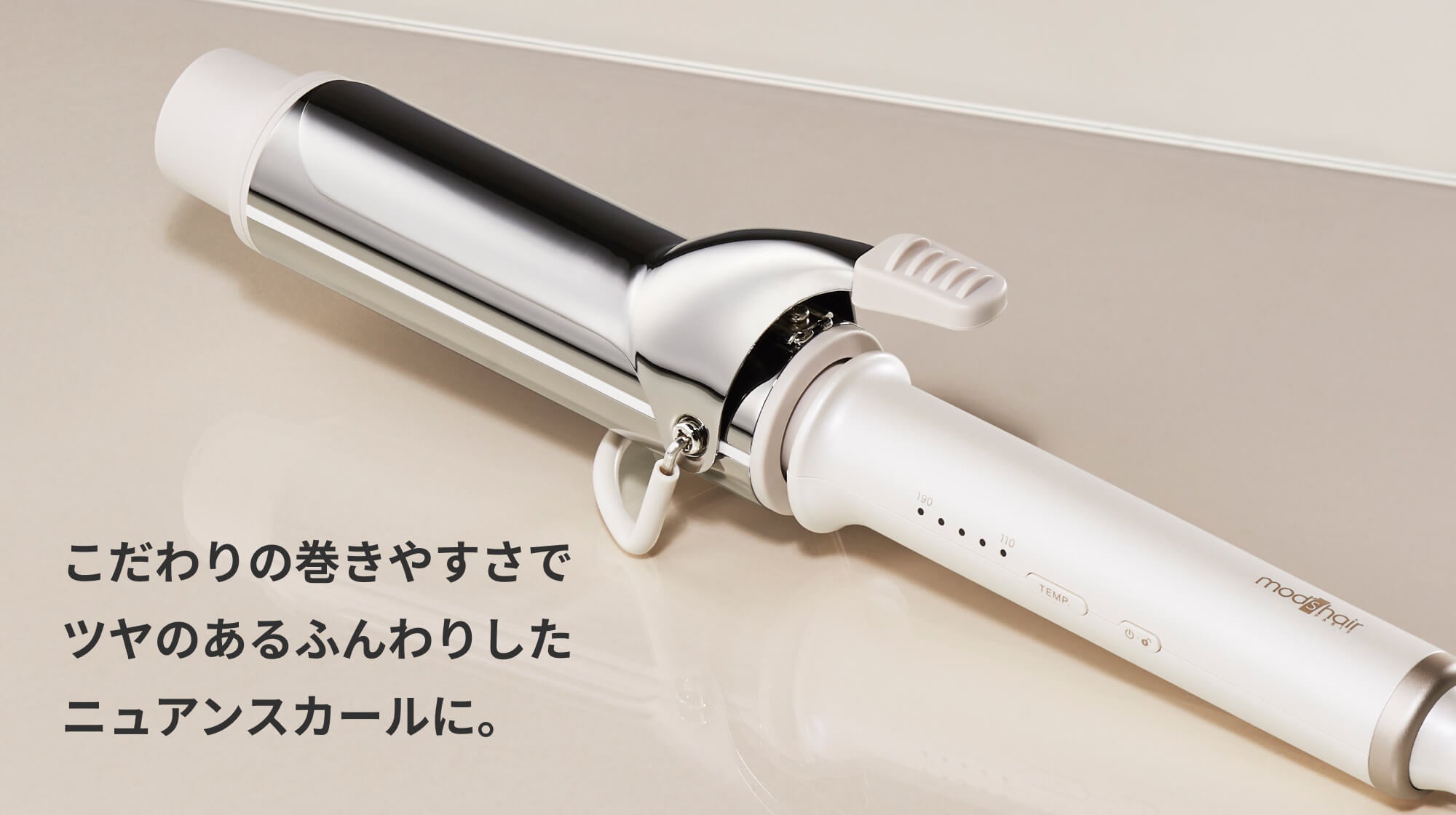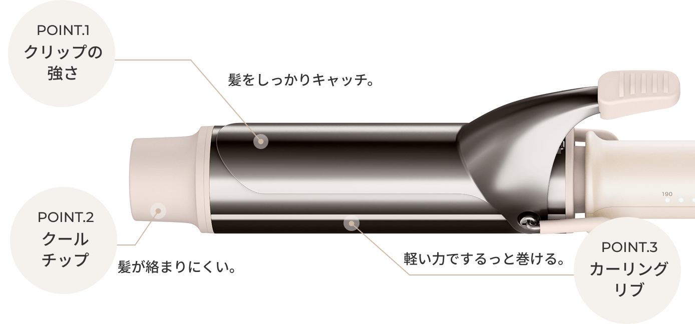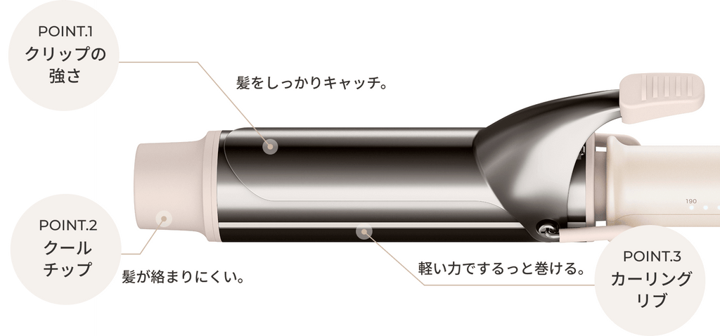 凹凸のないデザインで髪が絡まりにくく、巻きやすい。先端のクールチップは熱くなりづらく、スタイリングの支えとしても便利。